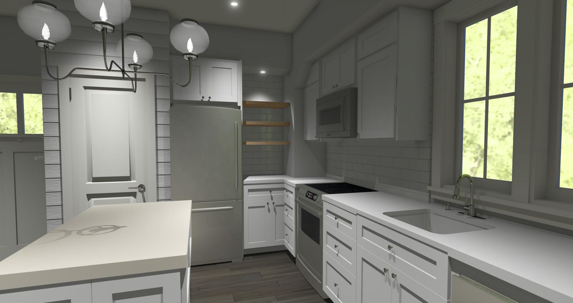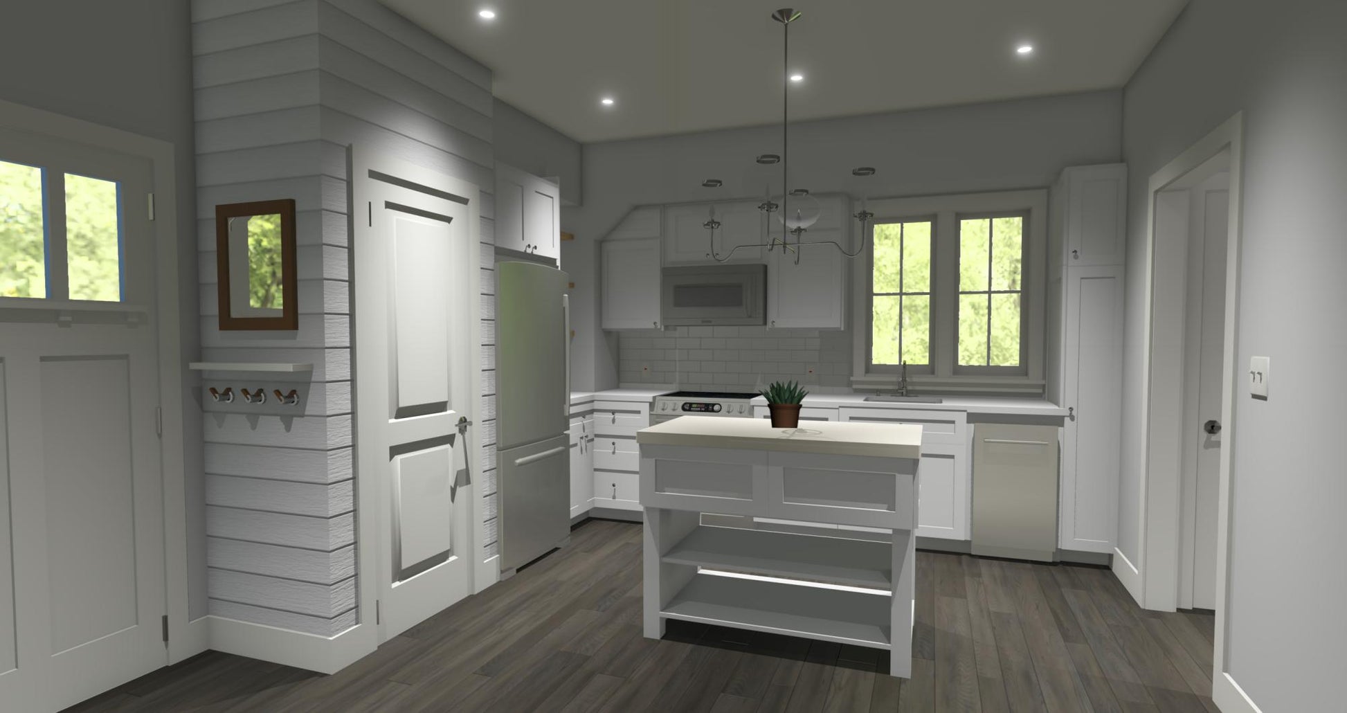 The Cloudy Bay garage plan has a 2-car garage with a spacious, open floor plan above. Full kitchen, bedroom, living area, bathroom, walk-in closet, and W/D are included.